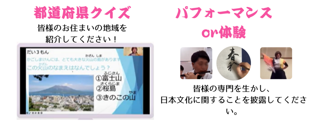 - 小学生と一緒にクイズ・パフォーマンス・地域紹介・体験レッスンを行います